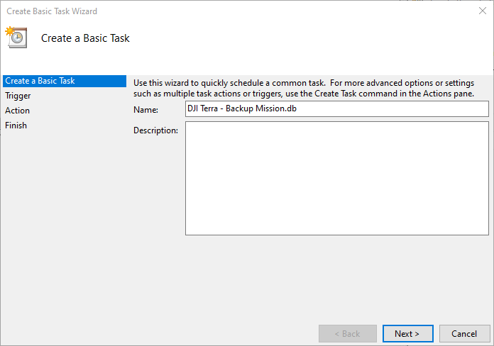 The task needs a descriptive name, I’ve chosen DJI Terra – Backup Mission.db, once entered press Next