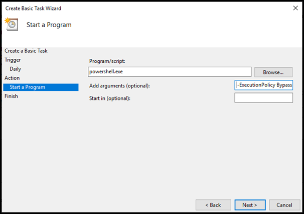 For the Add arguments (optional) text box enter the following after replacing the <DJI Cache Folder> references to become the path to your DJI Cache: -ExecutionPolicy Bypass –File <DJI Cache Folder>\MissionDBBackup.PS1, when done select Next